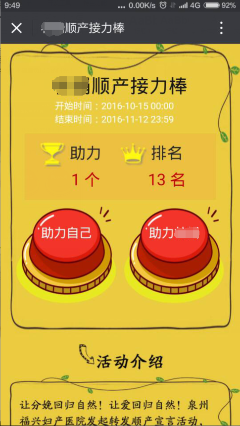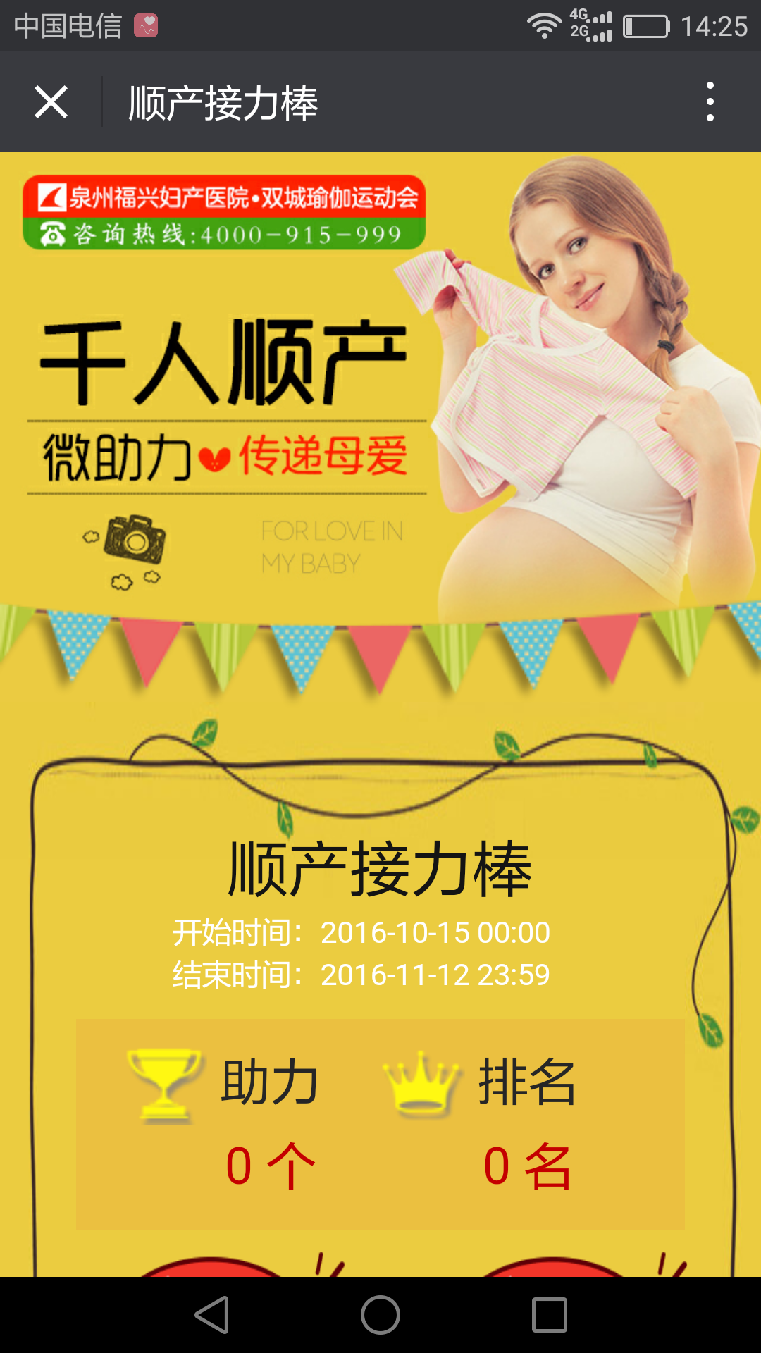关注“泉州福兴妇产医院”官方微信,进入公众号活动页面报名,按规则与模板填写完毕(填写姓名、联系电话),并转发朋友圈即成功参与,邀请朋友助力,并根据人气指数(点赞数)兑换相应奖励!(助力页面附孕妇瑜伽活动招募页面,可直接点击链接报名)